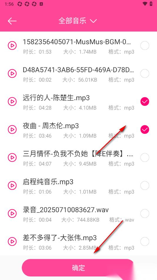3.来到当前打开的窗口中,即可查看到显示的音乐素材,选择需要拼接的音乐,在点击下方的【确定】。