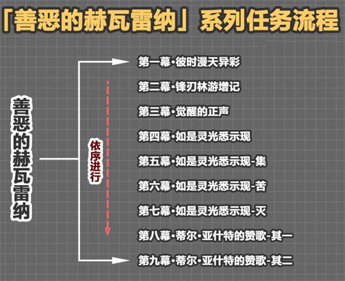 善恶的赫瓦雷纳在游戏中一共可以分为5个章节,分别是:彼时漫天异彩、锋刃林游增记、觉醒的正声、如是灵光悉示现、蒂尔·亚什特的赞歌。