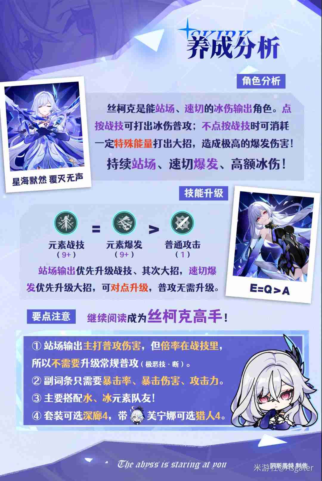 丝柯克是「五星冰系单手剑输出」,是个可以施放战技开启【强化普攻】模式的冰系大C,而且处于【强化普攻】下,大招会暂时失效,大招变成开启【超·强化普攻】模式,那么有不少小伙伴好奇丝柯克怎么培养,下面就来告诉大家。