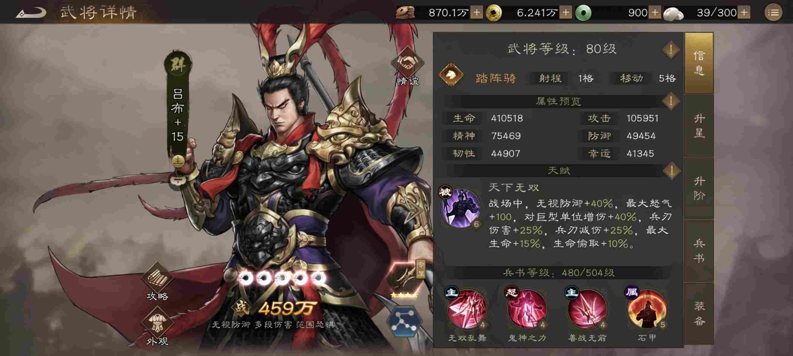 核心优势:无视防御(高额)、越战最强单体,击杀回怒(需4星神兵“方天画戟”解锁)。