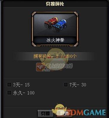 有些小伙伴可能会问:这款新的挑战武器怎么获得呢?冰火神拳的获得方式是完全免费得哦!刷新挑战地图,在守护者宝箱中一次可以开出5个碎片,15个碎片可以兑换3天、30个碎片可以兑换7天、100个碎片可以兑换永久!冰火神拳的兑换方式和冰火巨兽一致,都可以通过碎片获得,而且均可以兑换永久版本!