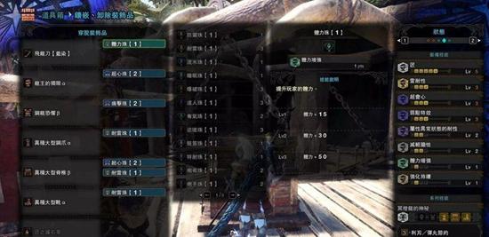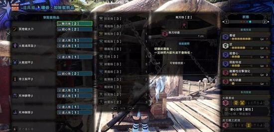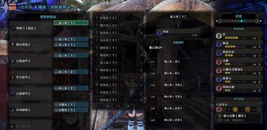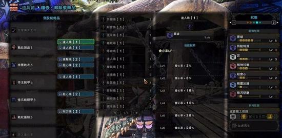 装备技能:匠5,雷属性3,超会心3,弱点特效3,属性异常状态的耐性2,减轻胆怯2,体力增强1,强化持续1。