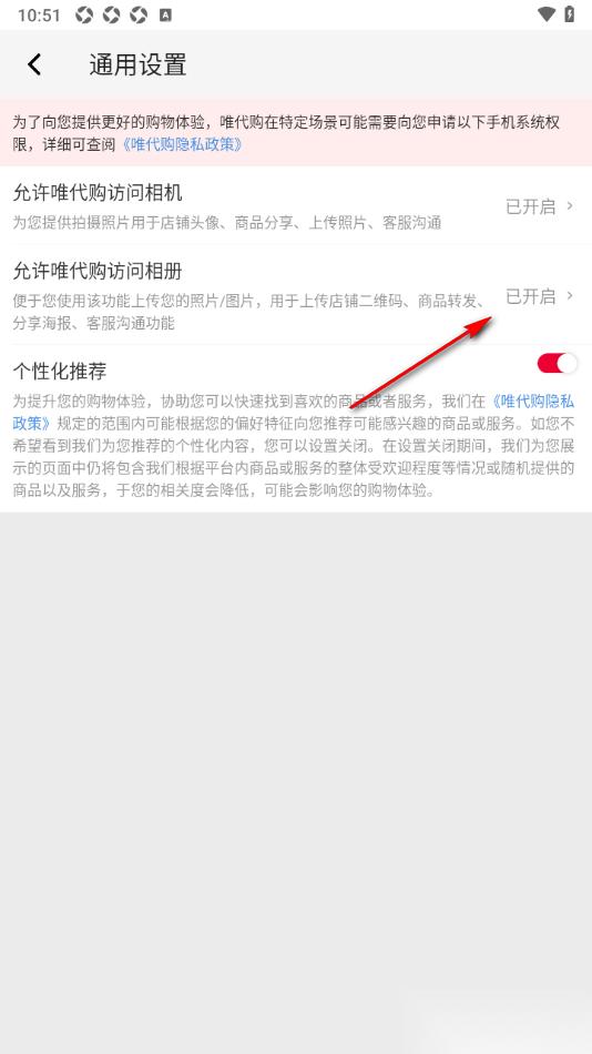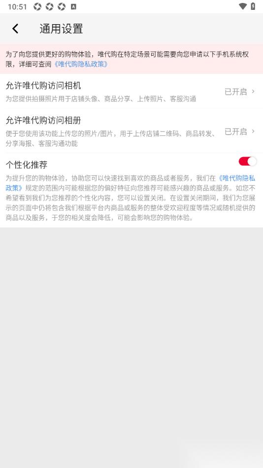 唯代购APP在小伙伴们的手机上会安装使用,对于平时经常会购买代购商品的用户,可以通过该软件来操作,所提供的商品信息是非常丰富的,十分的全面,在该软件中查看商品时,有些时候会上传本地图片进来搜索商品详情或者是上传店铺二维码信息、商品转发以及分享海报等,那么都需要使用到相册功能,如果该功能被禁用了,那么将会禁止图片上传以及分享海报等,对此用户需要打开该软件的通用设置窗口,确保相册权限功能是启用的,还可以设置访问相机功能,具体的教程方法已经显示如下。