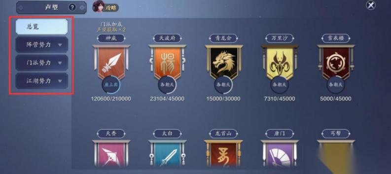 声望系统里,记录少侠们在各方势力所获得的声望。而声望的,主要源于三大势力:阵营势力、门派势力和江湖势力。