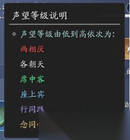 游戏中关于声望的等级划分说明非常明确,其中有:两相厌、各朝天、席中客、座上宾、行同路和念同心,这6个等级。