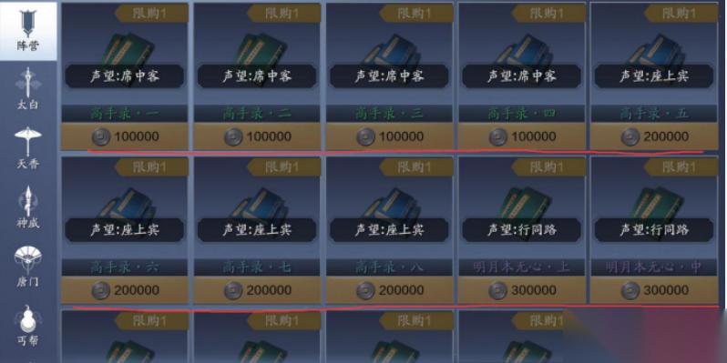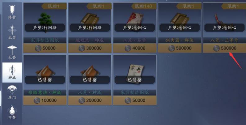 声望商店是声望系统里最核心的玩法,当我们的某一势力声望等级达到席中客及以上后,即可在声望商店对应势力位置处兑换相应道具;兑换道具需要一定的银币,道具品质越高花费的银币也会越高,但最高品质的道具也仅需50万银币就可以兑换了~