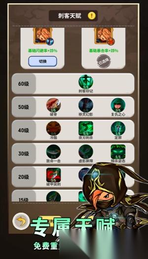 刺客:突击(单体),背刺(单体高伤),飞刀乱舞(群伤),幻影遁形(闪避),诡计(幻影遁形后增加攻击),夜刃(被动攻击),破甲突击(单体高伤),暗杀姿态(buff技能增伤并且概率刷新背刺、破甲突击cd,必点),夜刃刺杀(单体高伤),破骨(破甲突击无视防御),刺客印记(debuff,增伤),建议60转职幽冥