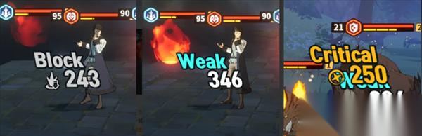 「有利属性造成的伤害」:根据攻击者与被攻击目标之间的属性相克机制,对造成伤害量进行增减处理。只有在使用「有利属性」攻击处于「不利属性」的敌人,造成克制伤害后,才显示蓝色的「WEAK」提示。