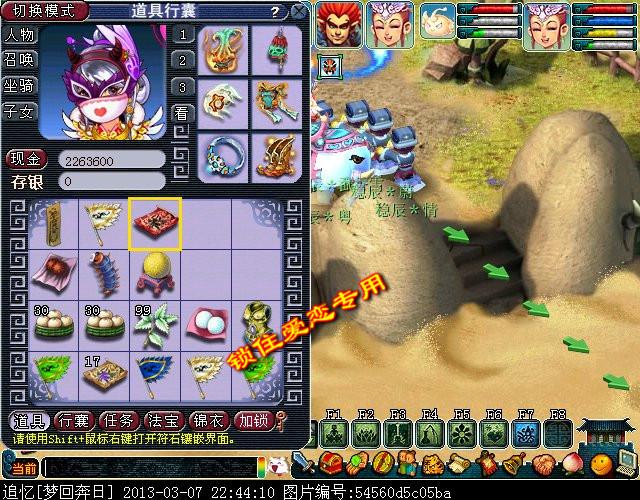 这里也是本次修改的地方:与江桃妹对话,然后跟江桃妹出去大唐境外找方寸山弟子,在江桃妹跑出魔王寨传送口的时候会发现她突然不见了,队长可以打开道具栏,右键使用追踪符。如上图,地上会出现绿色箭头指引方向,按照箭头指示走。