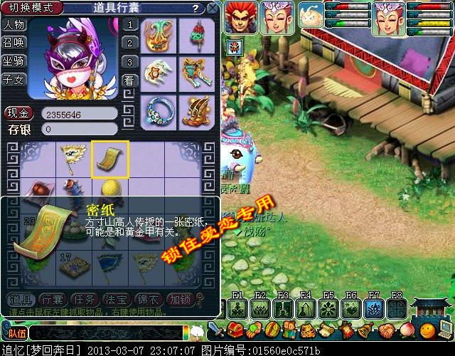 然后把纸人符给大堂内的方寸山弟子看,然后通过侍者传送出去,在魔王寨内找到方寸山的新娘,既江桃妹在之前的位置魔王寨(9.70).