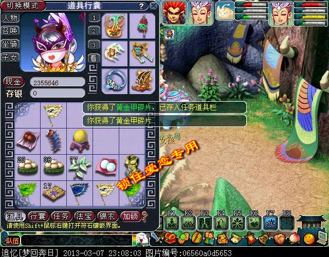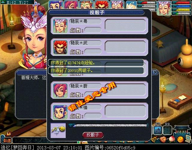 江桃妹让你去FC山找菩提。一阵对话之后,知道黄金甲是FC山门下宝物,然后就到了任务的结束奖励部分---丢色子。同时获得413424点经验,20010金钱,36点神器任务积分。