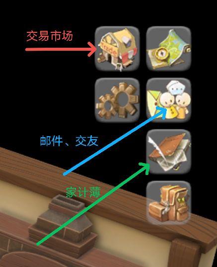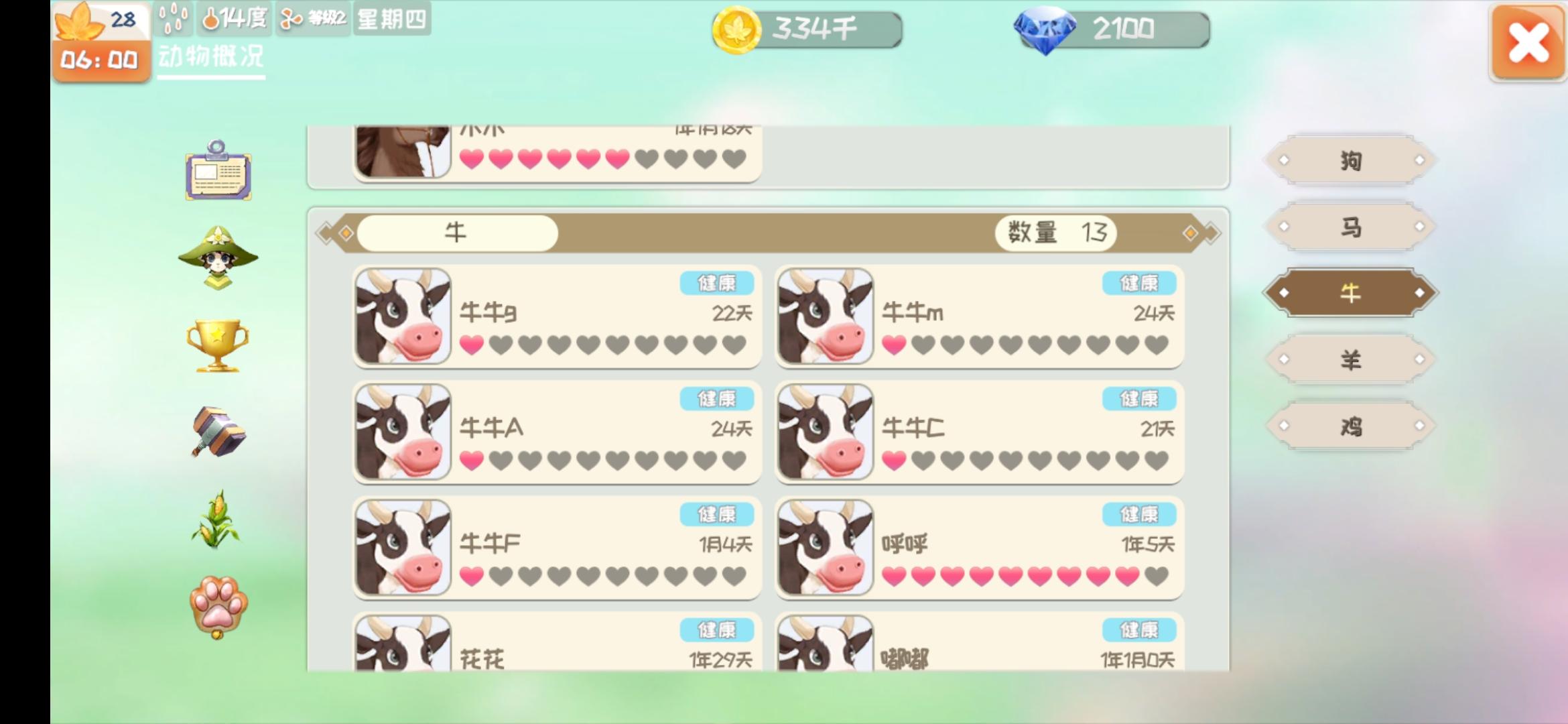 家计薄可以看自己的各种资源(动物数量、材料数量、饲料数量等);奖杯标志是成就;锤子标志是工具状况,可升级工具的使用经验也会显示;动物脚底标志可以看所有动物的健康状态和好感度。