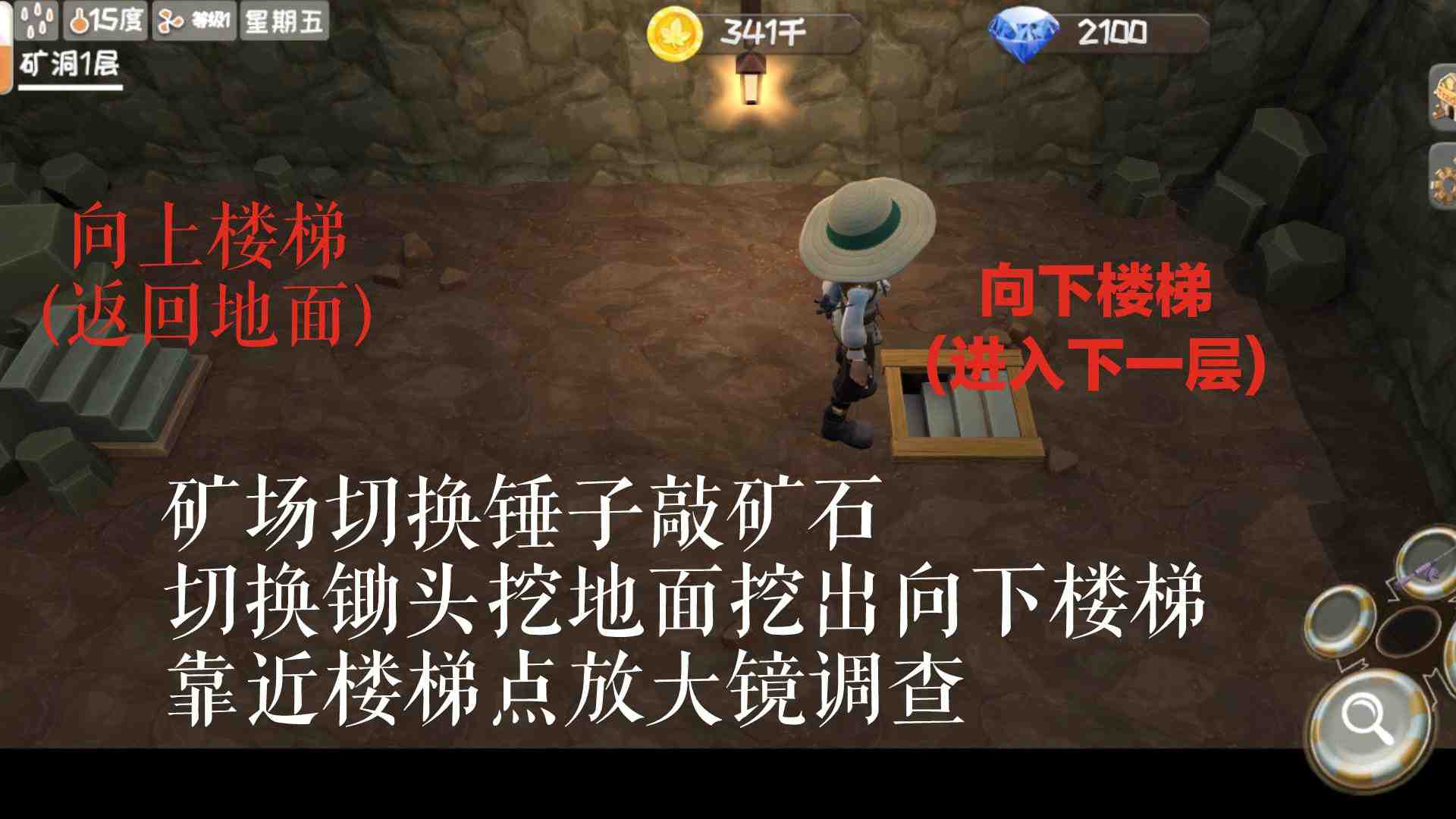 矿场在后山,锄头挖楼梯,锤子敲矿石。靠近楼梯调查,向上的楼梯可选择是否返回地面,向下的楼梯进入下一层。