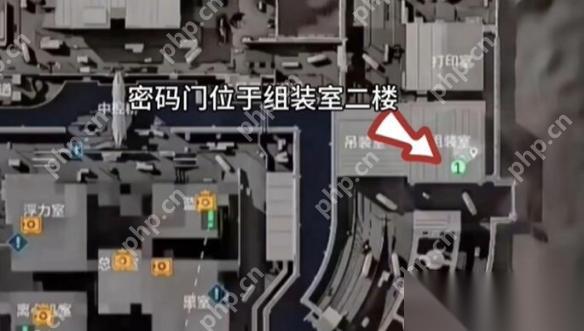 密码门位于右侧工业区组装室二楼,需通过楼梯进入并在室内仔细寻找。