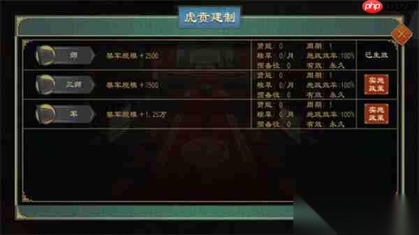 玩家可根据需要自由设定禁军的编制规模,包括师、三师或军级单位。禁军内部的三军、两翼、虎贲等组成部分支持手动配置,便于个性化打造精锐部队。